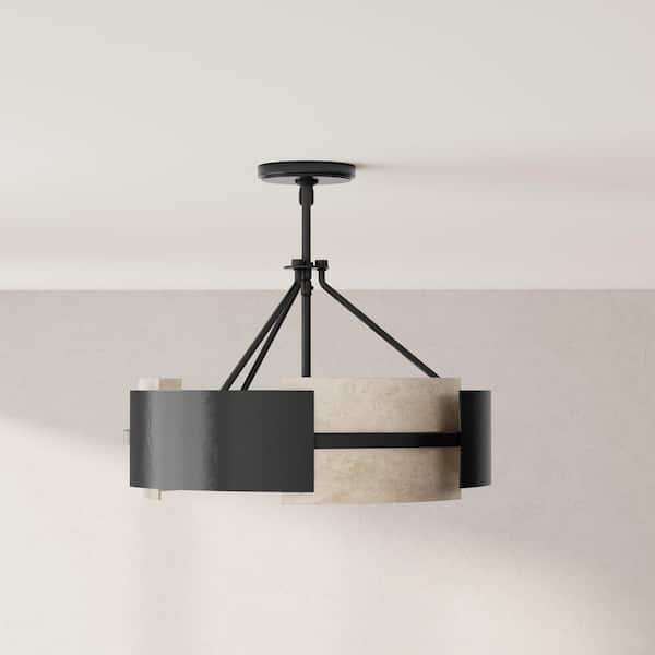 Lowery Collection 19 in. 3-Light Matte Black Industrial Luxe Semi-Flush Mount with Aged Silver Leaf Accent