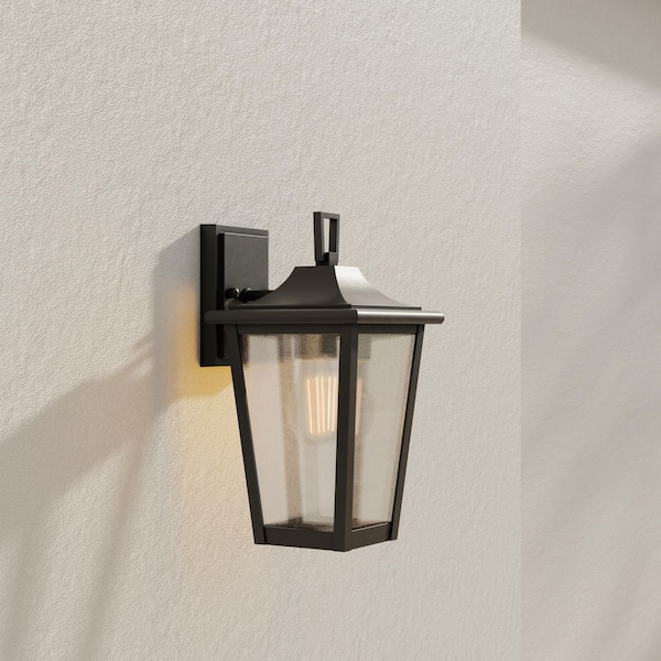 Padgett 1-Light Textured Black Hardwired Outdoor Wall Lantern with Clear Seeded Glass Shade Transitional