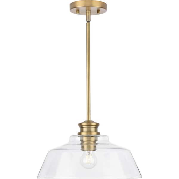 Singleton 1-Light 14 in. Vintage Brass Medium Pendant Light with Clear Glass Shade