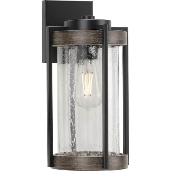 Whitmire 1-Light Matte Black with Aged Oak Accents Clear Seeded Glass Farmhouse Outdoor Wall Lantern Sconce