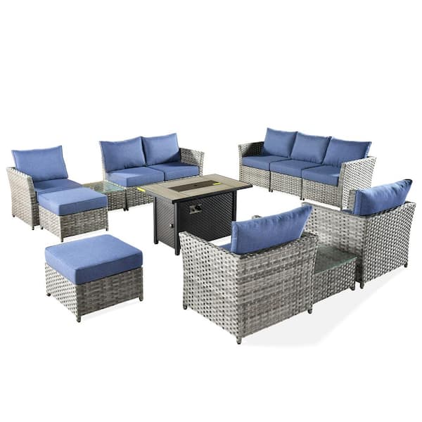 Prosperine Gray 13-Piece Wicker Outerdoor Patio Rectangular Fire Pit Sectional Seating Set with Denim Blue Cushions