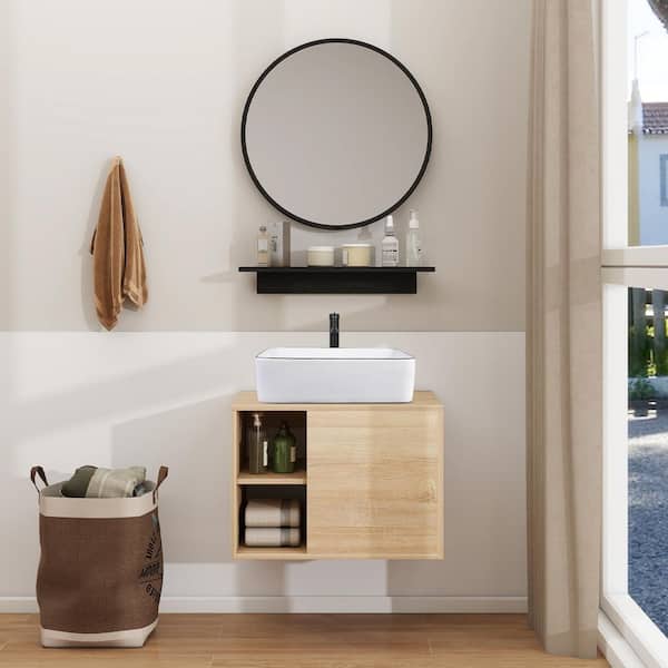 24 in. W x 19 in. D x17 in. H Single Sink Burlywood Bath Vanity with White Rectangular Solid Surface Top Sink and Mirror