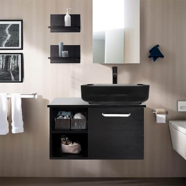 28 in. W x 19 in. D x 16 in. H Single Sink Bath Vanity in Black with Black Solid Surface Top and Mirror