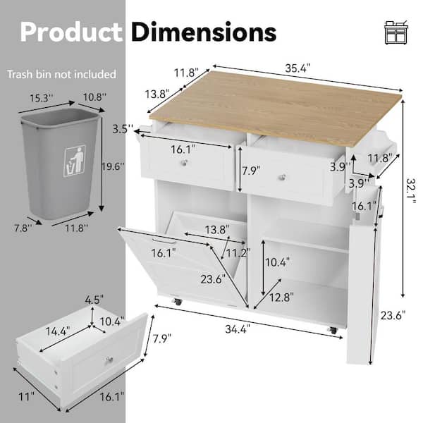 White/Natural Wood 35.4 in. W Kitchen Island Dining Table with Adjustable Shelves and Drawer and Spice and Tower Racks