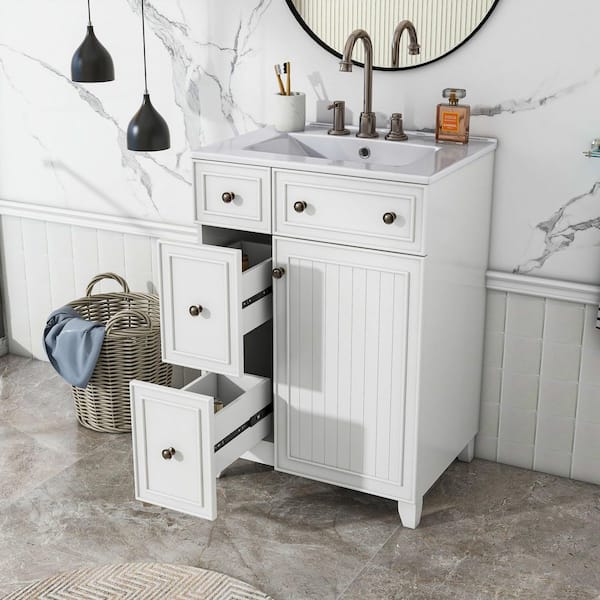 24in.W x 18.3 in.D x 34.3 in.H White Bathroom Vanity Cabinet Freestanding,2 Drawers, 1 Door,Top Ceramic with White Basin