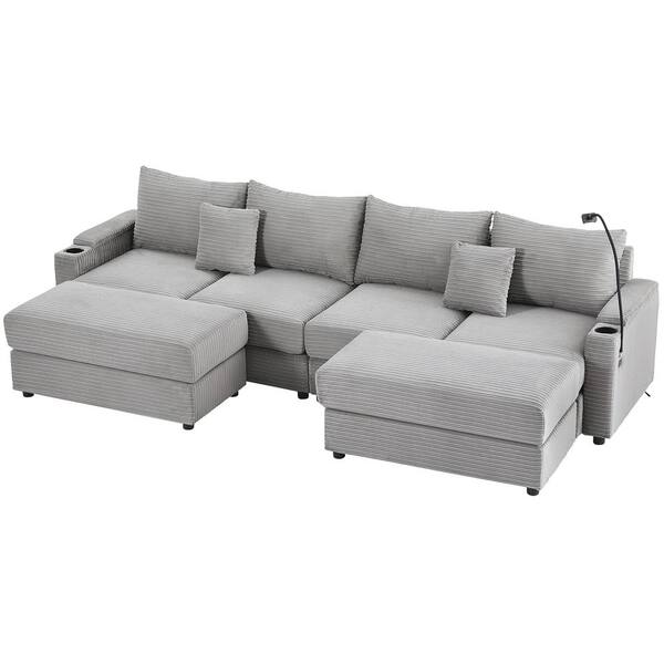 123.2 in. 3-piece Corduroy Sectional Sofa in Gray with 2 Movable Ottomans, 2 USB Ports and 2 Cup Holders