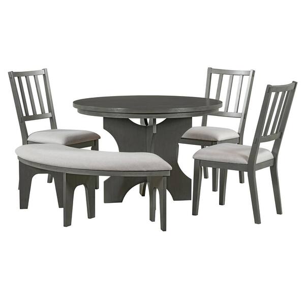 5-Piece Round Gray MDF Top Dining Room Set with 3-Upholstered Chairs and Curved Bench