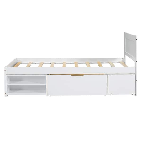 Antique White Wood Frame Twin Platform Bed with Two Double-layer Shelves and One Drawer