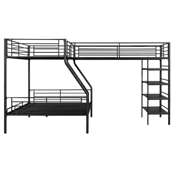 Black L-Shaped Metal Twin over Full Bunk Bed & Twin Size Loft Bed with 4 Shelves