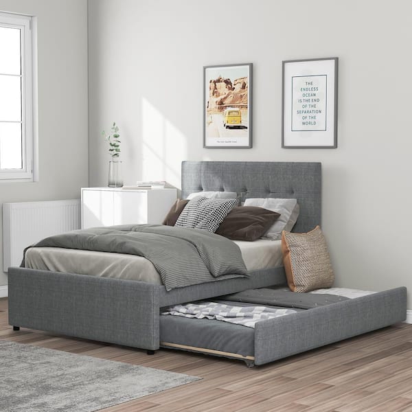 Gray Full Size Linen Upholstered Platform Bed with Headboard and Trundle