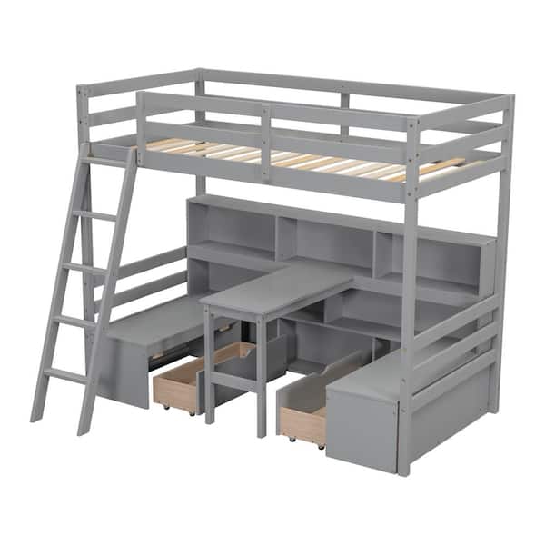 Gray Twin Size Loft Bed with Desk, Seats, Shelves and Drawers