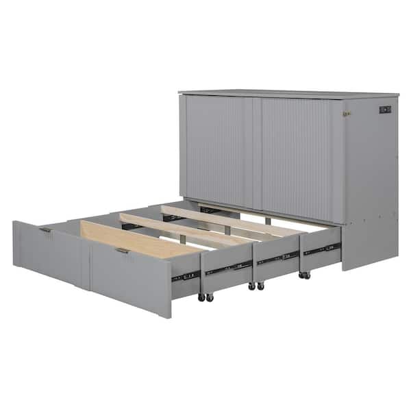 Gray Wood Frame Full Size Murphy Bed with Drawer, Sockets and USB Ports