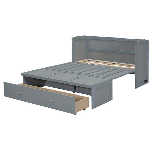 Gray Wood Frame Full Size Murphy Bed with USB Port and Drawer