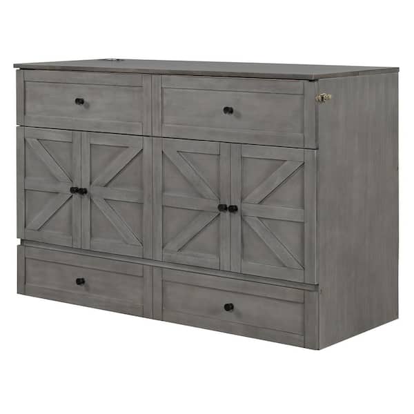 Gray Wood Frame Queen Murphy Bed with USB Ports and Drawer