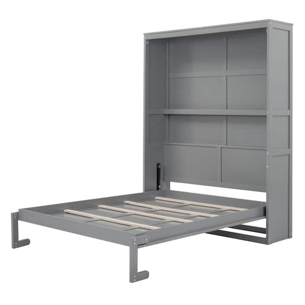 Gray Wood Frame Queen Size Murphy Bed with Shelves
