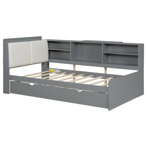 Gray Wood Frame Twin Size Platform Bed with Trundle and Upholstery Storage Headboard