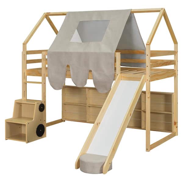 Natural and Beige Twin Size Loft Bed with Tent