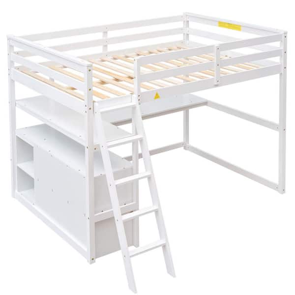 White Full Pine and MDF Loft Bed with Desk and Shelves
