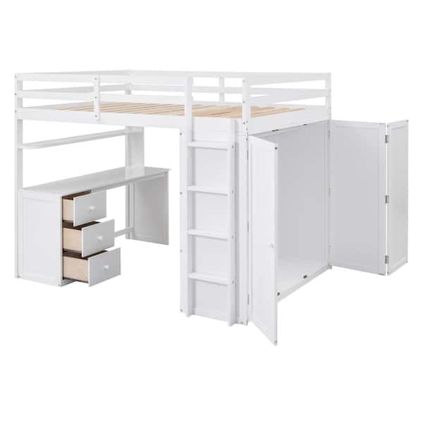 White Full Size Loft Bed with Drawers, Desk, and Wardrobe