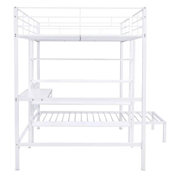 White Full over Twin Metal Bunk Bed with Built-in Desk and Shelves