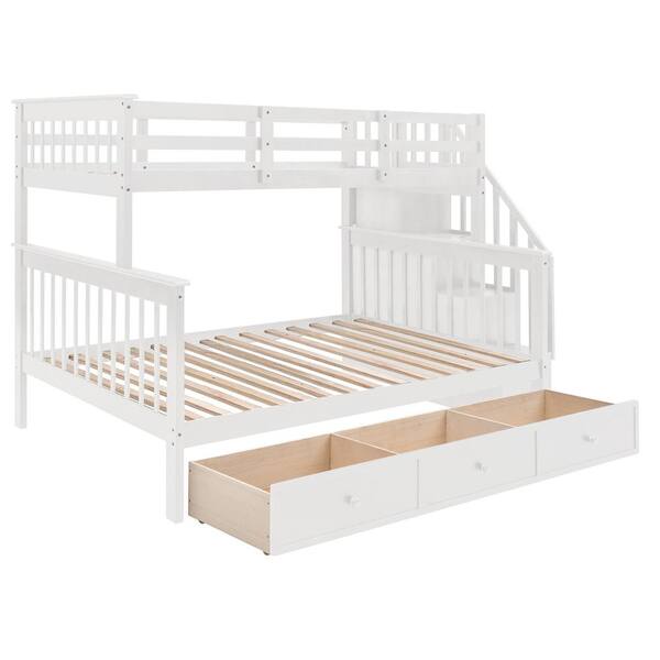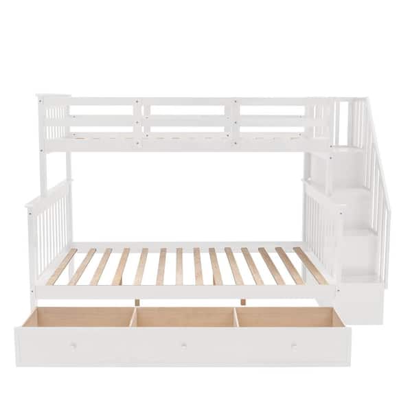 White Stairway Twin Over Full Bunk Bed with Drawer and Shelves