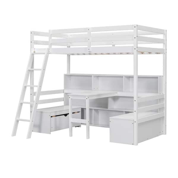 White Twin Size Loft Bed with Desk, Seats, Shelves and Drawers