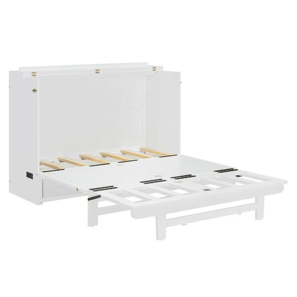 White Wood Frame Full Size Murphy Bed with Drawer, USB Ports and Outlets