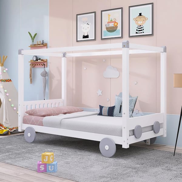 White Wood Frame Twin Size Canopy Car-Shaped Platform Bed