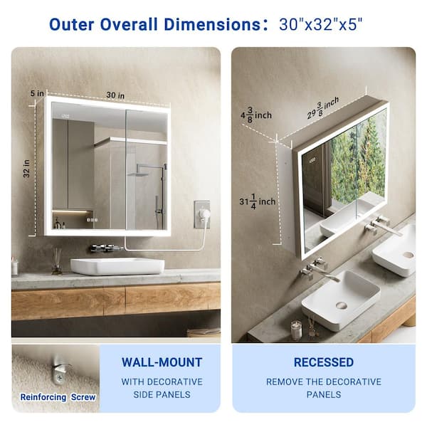 Elega 30 in. W x 32 in. H Rectangular Aluminum Recessed/Wall Mount Dimmable Fogless Lighted Medicine Cabinet with Mirror