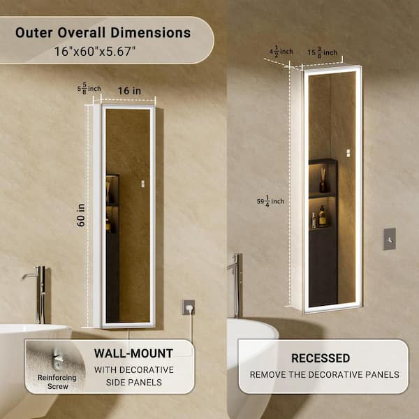 Nova 16 in. W x 60 in. H Rectangular Aluminum Recessed/Surface Dimmable LED Medicine Cabinet with Mirror,Storage Cabinet