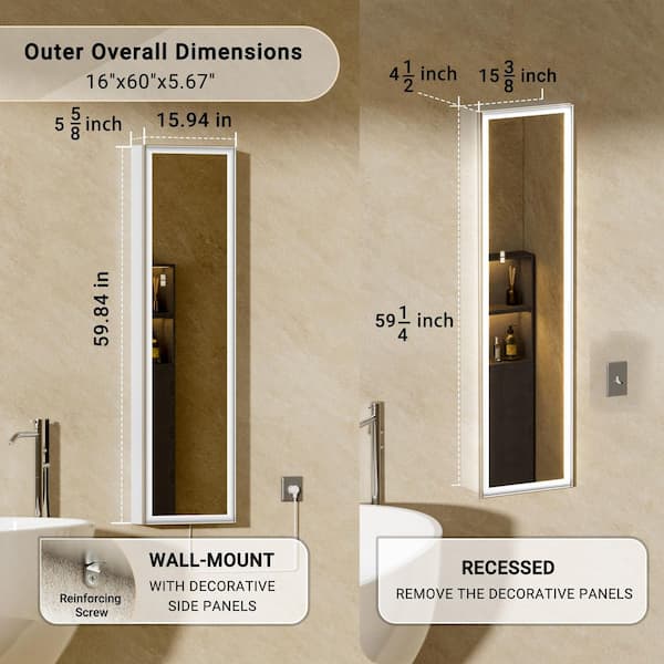 Nova 16 in. W x 60 in. H Right Rectangular Aluminum Recessed/Surface Dimmable Fogless LED Medicine Cabinet with Mirror