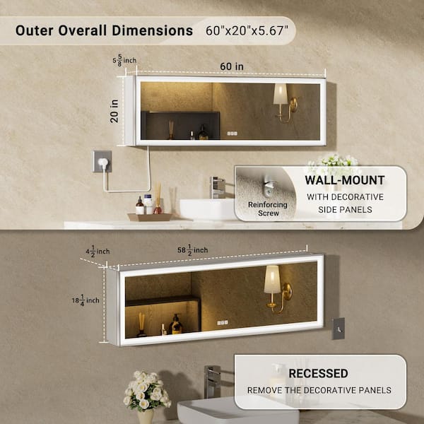 Nova 60 in. W x 20 in. H Rectangular Aluminum Recessed/Wall Mount Dimmable Fogless Lighted Medicine Cabinet with Mirror