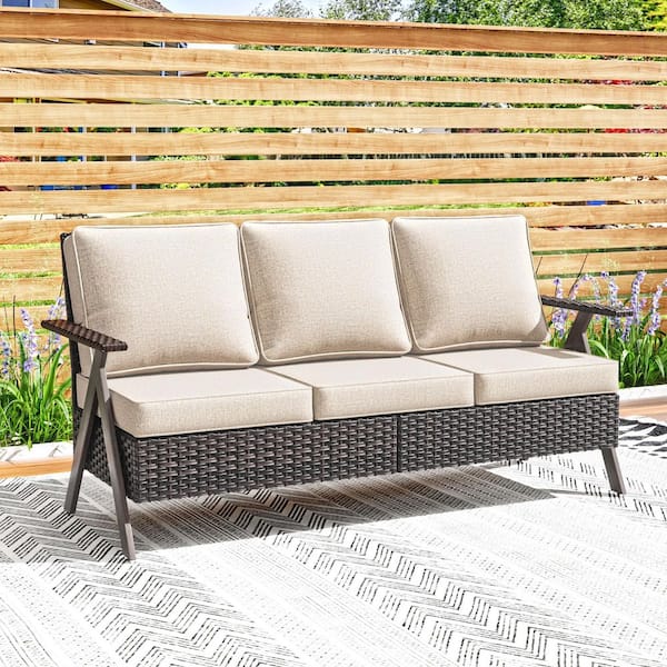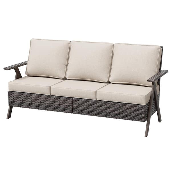 R-Shaped Armrest 3-Seat Brown Wicker Outdoor Patio Couch with Beige Cushions