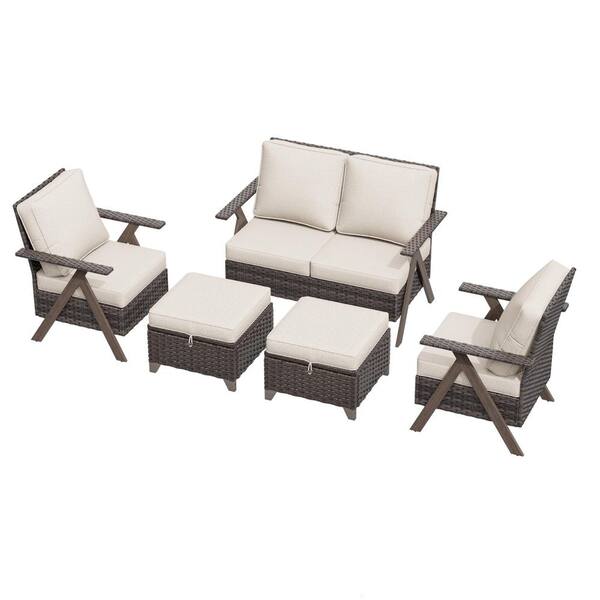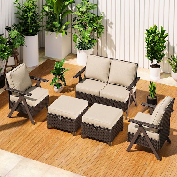 R-Shaped Armrest 5-Piece Wicker Outdoor Patio Conversation Set Loveseat and Ottomans with Beige Cushions