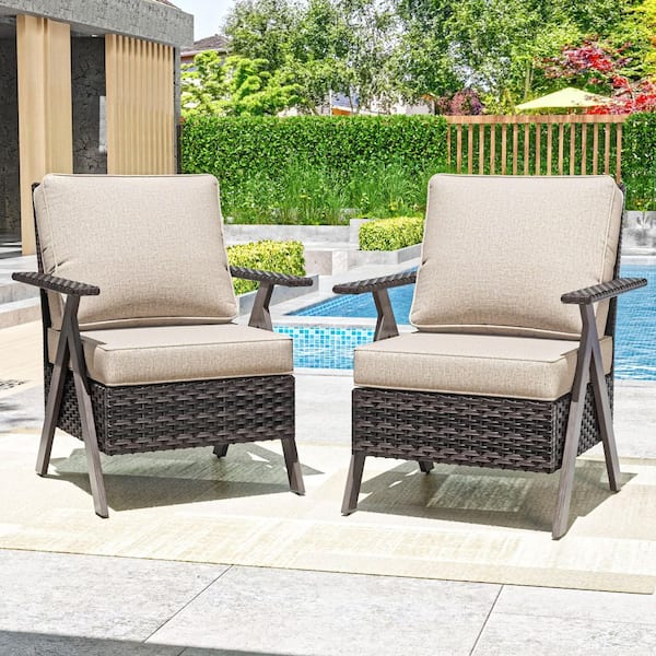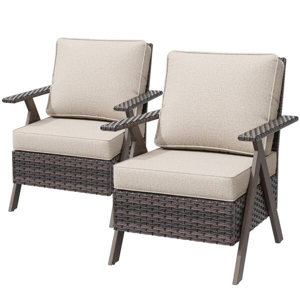 R-Shaped Armrest Brown Wicker Outdoor Patio Lounge Chair with Beige Cushions (2-Pack)