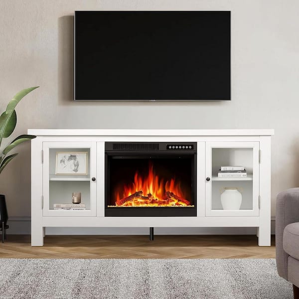 58 in. Freestanding Wooden Electric Fireplace TV Stand in White