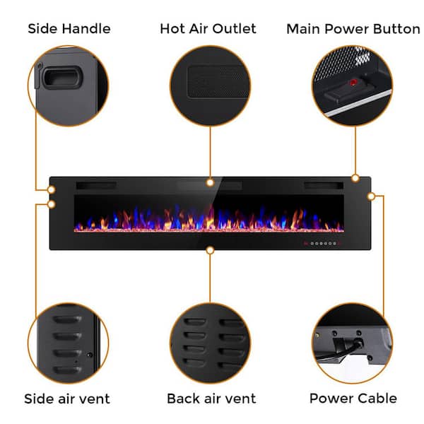 68 in. Wall Mount Low Noise Electric Fireplace with Remote Control and Touch Screen, Multi Color Flame in Black