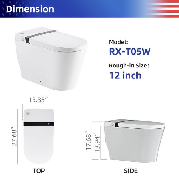 Elongated Bidet Toilet 0.8 GPF in White with Adjustable Sprayer Settings, Deodorizing, Soft Close
