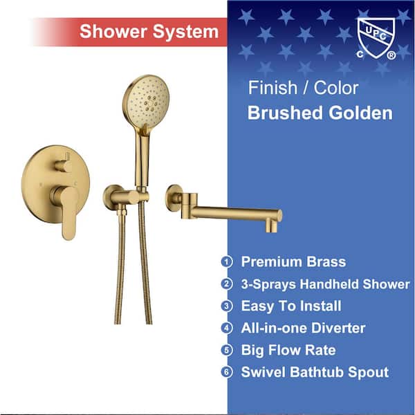 Round Single-Handle Wall Mount Roman Tub Faucet with Swivel Spout in Brushed Gold (Valve Included)