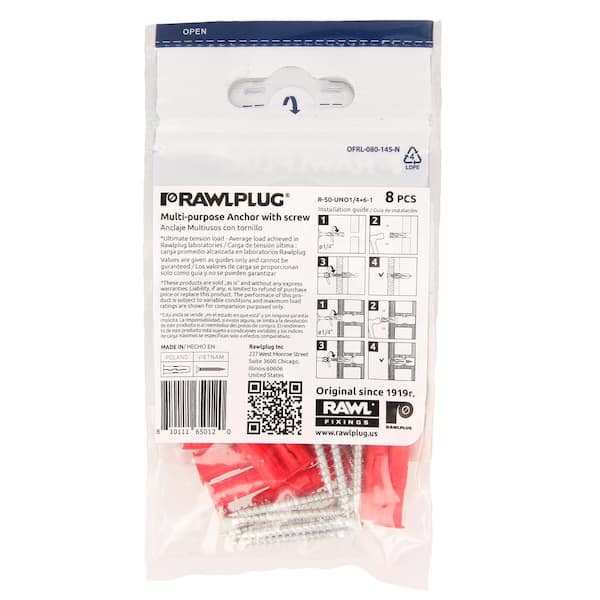 Uno Multi-Purpose Drywall Anchors 1/4 with Screws #6 x 1-1/2 19 lbs. (Pack of 8)