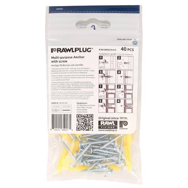 Uno Multi-Purpose Drywall Anchors 3/16 with Screws #6 x 1-1/2 11 lbs. (Pack of 40)