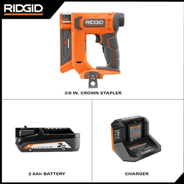 • Includes: 3/8 in. Crown Stapler, 2.0 Ah Battery, and Charger