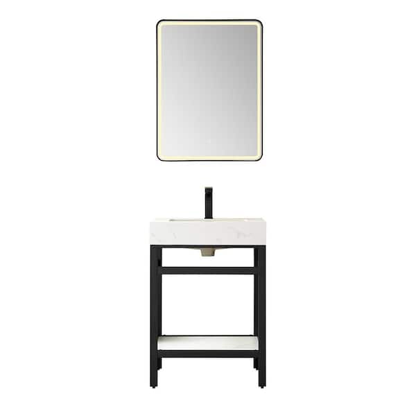 Funes 24 in. W x 22 in. D x 34 in. H Single Sink Bath Vanity in Matt Black with White Natural Stone Top and Mirror