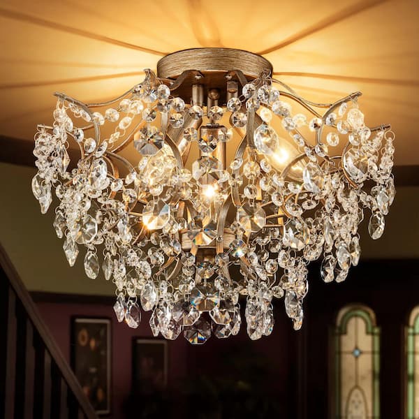 Abbie 15.7 in. 3-Light Modern Glam Brushed Champagne Gold Crystal Semi-Flush Mount Light with Crystal Beads