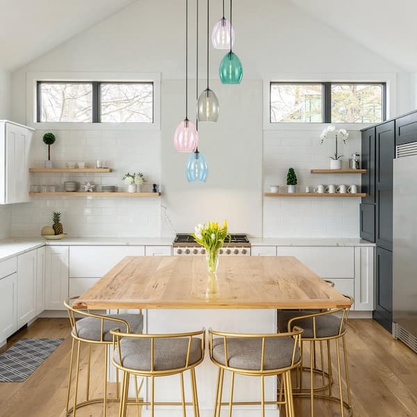 • Cut-out olive glass shades in pastel colors add a playful touch