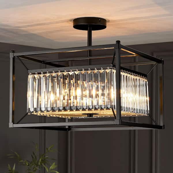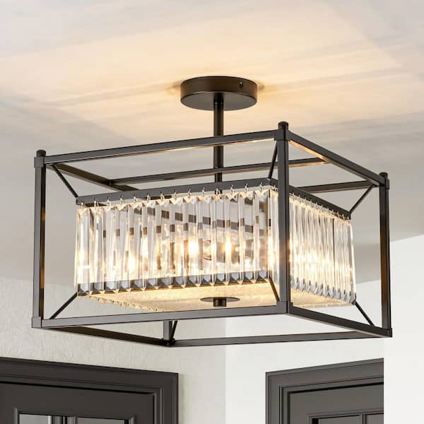 Annedore 15.75 in. 4-Light Mid-Century Modern Black Square Metal Frame Crystal Semi-Flush Mount Light