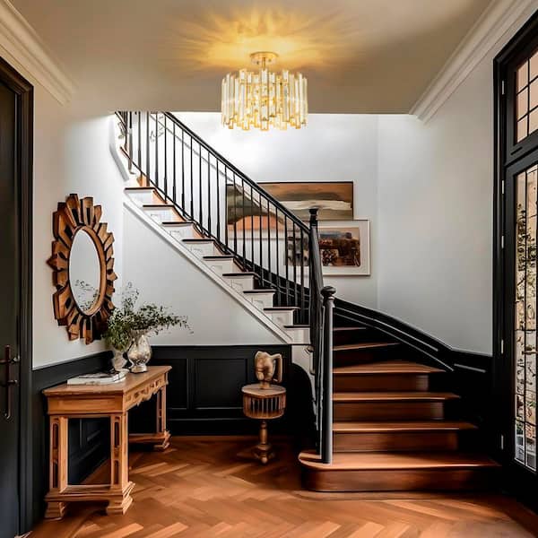 Douthit 14 in. 5-Light Modern Gold Cylinder Drum Crystal Semi-Flush Mount Ceiling Light with Shade