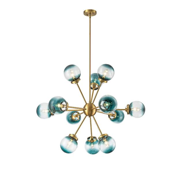 Khambrel 12-Light Modern Glam Brushed Gold Linear Sputnik Gradient Blue Glass Globe Bubble Chandelier