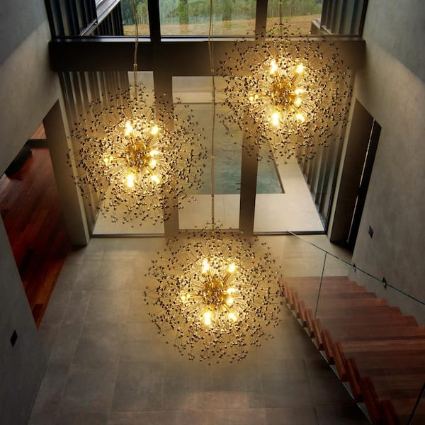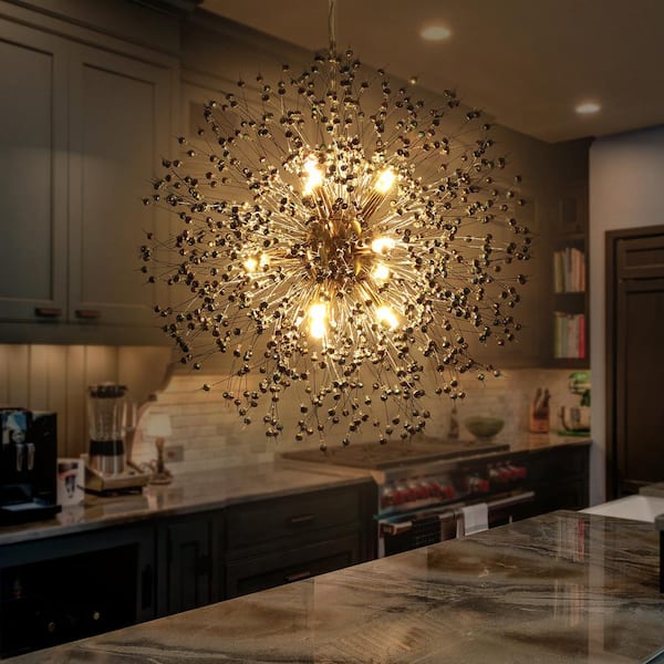Mucha 9-Light Gold Modern Glam Linear Sputnik Starburst Crystal Chandelier for Dining Room with Iridescent Crystal Beads