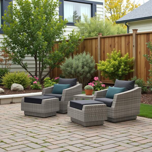 Cannes 5-Piece All Weather Wicker Patio Club Chair and Ottoman Conversation Set with Gray Cushions